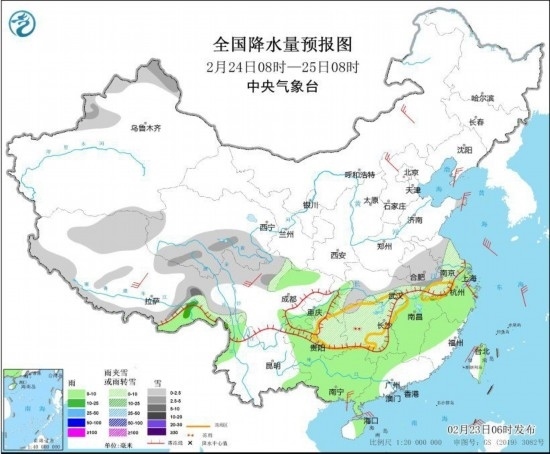 2月24日8時至25日8時,新疆北疆西部和北部、西藏北部和東部、青海南部、川西高原北部、江漢東部、江淮、江南西部和北部、貴州東部等地的部分地區(qū)有小到中雪或雨夾雪,其中西藏東部等地的部分地區(qū)有大到暴雪。江南中東部、四川盆地、華南中西部、貴州西部、云南北部、西藏東南部等地有小到中雨。內蒙古中部、河北北部、遼東半島、山東半島、浙江北部、西藏、川西高原北部、廣西南部沿海等地的部分地區(qū)有4~6級風。黃海南部、臺灣海峽、南海東北部海域有5~7級、陣風8級的偏北風。