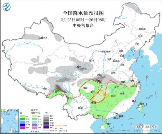 2月25日8時至26日8時,新疆伊犁河谷和北疆東北部、黑龍江西北部、西藏東部、川西高原北部、青海東部、西北地區(qū)東部、黃淮西部、安徽中南部、江漢、江南西部、貴州東部等地的部分地區(qū)有小到中雪或雨夾雪,其中西藏東部、陜西南部等地的部分地區(qū)有大到暴雪。江漢東部、江南大部、西南地區(qū)東部、華南中西部、云南西北部等地的部分地區(qū)有小到中雨。內蒙古中東部、遼東半島、山東半島、浙江東部、廣西南部沿海等地的部分地區(qū)有4~6級風,其中川西高原北部等地的部分地區(qū)風力可達7級以上。黃海南部、東海北部、臺灣海峽、南海東北部海域有5~7級、陣風8級的偏北風。