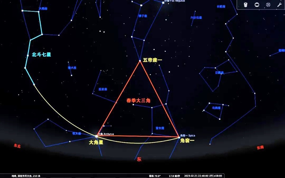 (4)找到“角宿一”和“角宿二”,就找到了蒼龍七宿中的第一宿——“角宿”。(恭喜你,找到“龍首”啦)