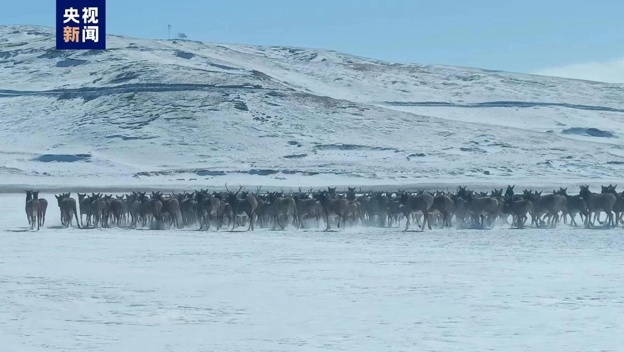 壯觀!超400只白唇鹿在黃河冰面上遷徙。