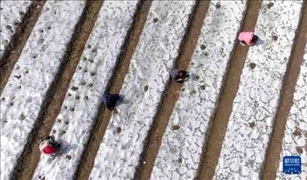3月4日,村民在羅甸縣逢亭鎮(zhèn)粵港澳大灣區(qū)蔬菜保供基地種鮮食玉米(無人機(jī)照片)。