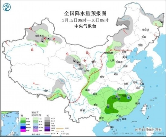 3月15日08時至16日08時,新疆北部、青海北部、甘肅、內(nèi)蒙古東部、黑龍江北部、河北西北部等地部分地區(qū)有小到中雪或雨夾雪,其中,新疆沿天山地區(qū)、青海東北部、黑龍江東北部等地部分地區(qū)有大雪(5~8毫米)。甘肅南部、寧夏南部、陜西西南部、湖北南部、湖南、江西大部、重慶東部、貴州大部、華南大部等地部分地區(qū)有小到中雨,其中,湖南東北部、江西中部、廣西東北部等地部分地區(qū)有大雨(25~35毫米)。新疆北部、青海東部、甘肅、內(nèi)蒙古大部、黑龍江東部、吉林東部等地部分地區(qū)有4~6級風,其中,新疆伊犁河谷和沿天山地區(qū)等地有8~9級風,山口風力可達10~11級。新疆東部和南部、內(nèi)蒙古西部、青海西北部、甘肅中西部、寧夏、陜西北部等地的部分地區(qū)有揚沙或浮塵天氣,內(nèi)蒙古西部、甘肅中部局地有沙塵暴。