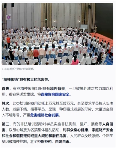 ·起底被公安機關打擊查處的“靈修”組織:打著“靈修”“靈魂塑造”等旗號,對學員實施精神控制;借“靈修”提升之名,行“精神傳銷”之實。鄧海鵬及其創(chuàng)辦的培訓機構,打著“靈魂塑造”“集體場域”的幌子,對學員進行精神控制,然后以傳銷、加盟、進階等現(xiàn)代營銷模式達到斂財漁色目的。人前他要求學員全部吃素,自己每天大魚大肉,必吃海參;人前他要求學員不能有不動產、錢是修行來的,自己卻拿著騙來的錢去買理財產品;人前他無兒無女,實則有妻有女;人前假裝不近女色,背地里卻漁色女學員。