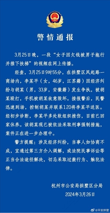 ·杭州拱墅警方通報女子被拖行推下扶梯:因經濟糾紛起爭執(zhí),男子被依法采取刑事強制措施。