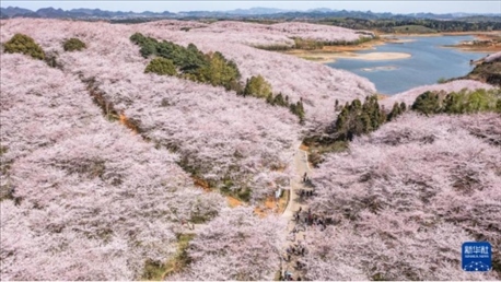 近日,貴州省貴安新區(qū)櫻花園內的2.4萬畝櫻花迎來盛花期,花團錦簇,春意盎然,吸引各地游客前來賞花游玩。?
