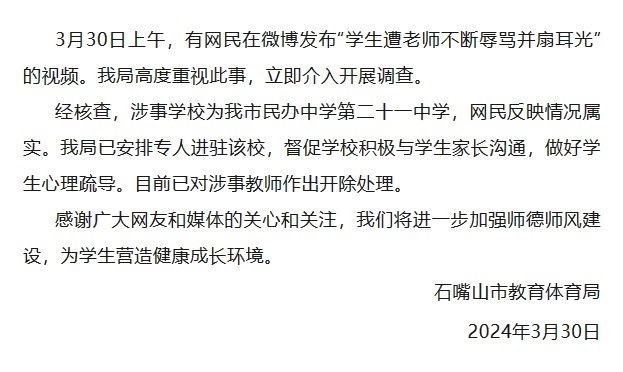 央視網消息:據寧夏石嘴山市教育體育局微信公眾號消息,寧夏石嘴山市教育體育局3月30日發(fā)布關于網友反映“學生遭老師不斷辱罵扇耳光”的情況說明。