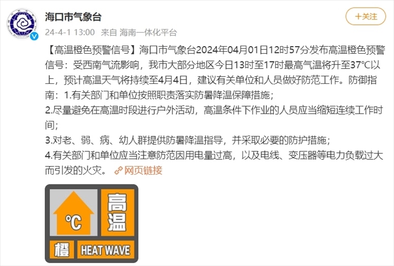 央視網(wǎng)消息:據(jù)@??谑袣庀笈_ 微博消息,海口市氣象臺2024年04月01日12時57分發(fā)布高溫橙色預(yù)警信號:受西南氣流影響,??谑写蟛糠值貐^(qū)今日13時至17時最高氣溫將升至37℃以上,預(yù)計高溫天氣將持續(xù)至4月4日,建議有關(guān)單位和人員做好防范工作。