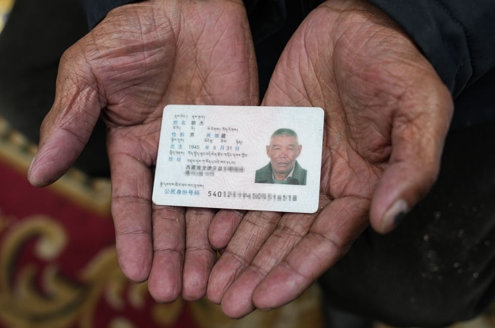 朗杰展示自己的身份證(3月13日攝)。新華社記者 晉美多吉 攝