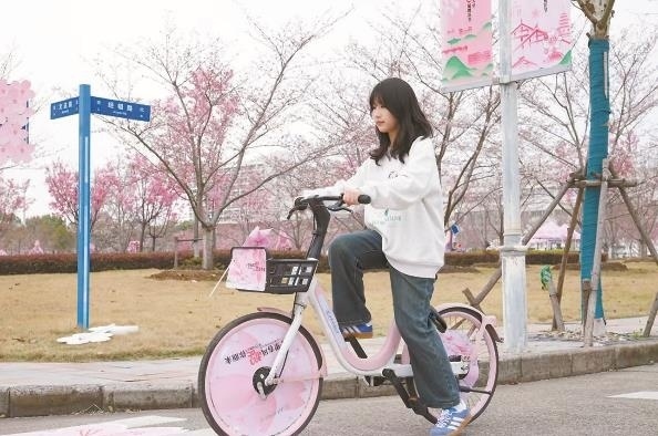 櫻花節(jié)期間,學(xué)校是禁止機(jī)動(dòng)車(chē)入校的。校園大,游人累了怎么辦?上經(jīng)貿(mào)大學(xué)生食堂門(mén)口便出現(xiàn)了一道亮麗的風(fēng)景線(xiàn):那就是學(xué)校和“哈啰單車(chē)”聯(lián)名的粉色共享單車(chē)。50輛粉色的單車(chē)整齊排放在廣場(chǎng)上,車(chē)頭的粉色風(fēng)車(chē)迎風(fēng)轉(zhuǎn)動(dòng),櫻花節(jié)專(zhuān)屬I(mǎi)P“貿(mào)小櫻”人偶,揮舞著雙手邀請(qǐng)師生們前來(lái)騎行。聯(lián)名活動(dòng)設(shè)計(jì)了賞櫻打卡點(diǎn),游客可以騎著櫻花單車(chē)游覽校園,在3個(gè)最佳賞櫻點(diǎn)拍照打卡,體驗(yàn)各處櫻花的詩(shī)情畫(huà)意。