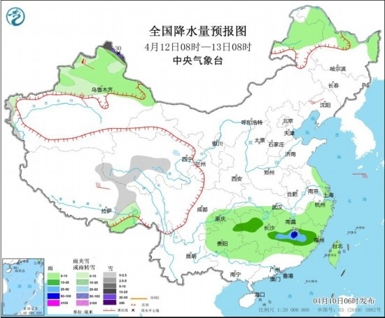 4月12日08時至13日08時,新疆北疆北部和沿天山地區(qū)、西藏東部、青海南部等地部分地區(qū)有小到中雪或雨夾雪,其中,新疆北疆北部的部分地區(qū)有大到暴雪,局地大暴雪(20~30毫米)。貴州西北部、湖南中部、江西中部、福建中部等地部分地區(qū)有中到大雨,其中,江西東部的部分地區(qū)有暴雨(50~70毫米)。新疆南疆盆地、西藏北部、遼寧西部等地部分地區(qū)有4~6級風(fēng),其中,新疆北疆北部部分地區(qū)有8~9級風(fēng);渤海、渤海海峽、黃海大部海域部分海域?qū)⒂?~7級。