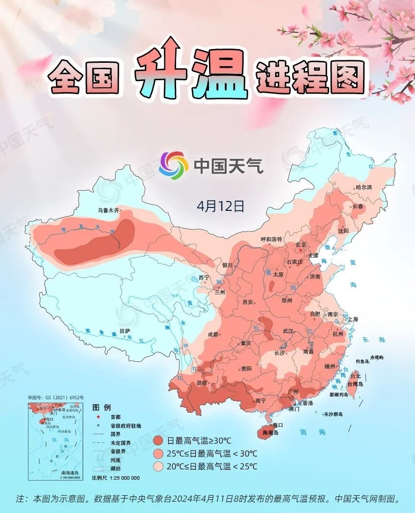 眼下,全國大部處于冷空氣影響間歇期,升溫是主旋律。預(yù)計今起三天(4月11日至13日),我國從北到南都將開啟回暖進程,最高氣溫25℃以上的區(qū)域幾乎覆蓋整個中東部,波及20余省份,東北、西北地區(qū)氣溫將大面積創(chuàng)今年以來新高,北方不少地方還會體驗到常年5月中旬才有的超前暖熱。中國天氣網(wǎng)推出全國升溫進程圖,看看哪些地方將沖擊30℃。
