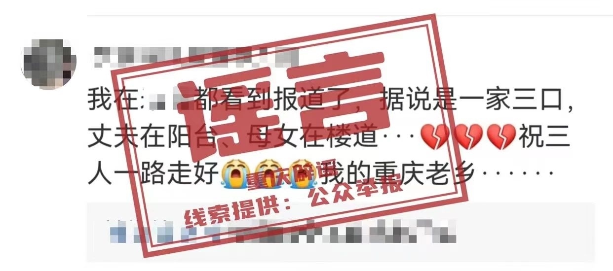 4月15日,“重慶辟謠”發(fā)消息稱,經(jīng)相關部門核查,沙坪壩、合川均未發(fā)生“一家人全部上吊而死”案件,網(wǎng)傳信息為謠言,相關視頻系某網(wǎng)民拼湊網(wǎng)上的兩起自殺事件,并杜撰虛假信息。目前,該虛假信息已轉(zhuǎn)交相關部門,以對發(fā)布虛假信息者依法進行調(diào)查處置。