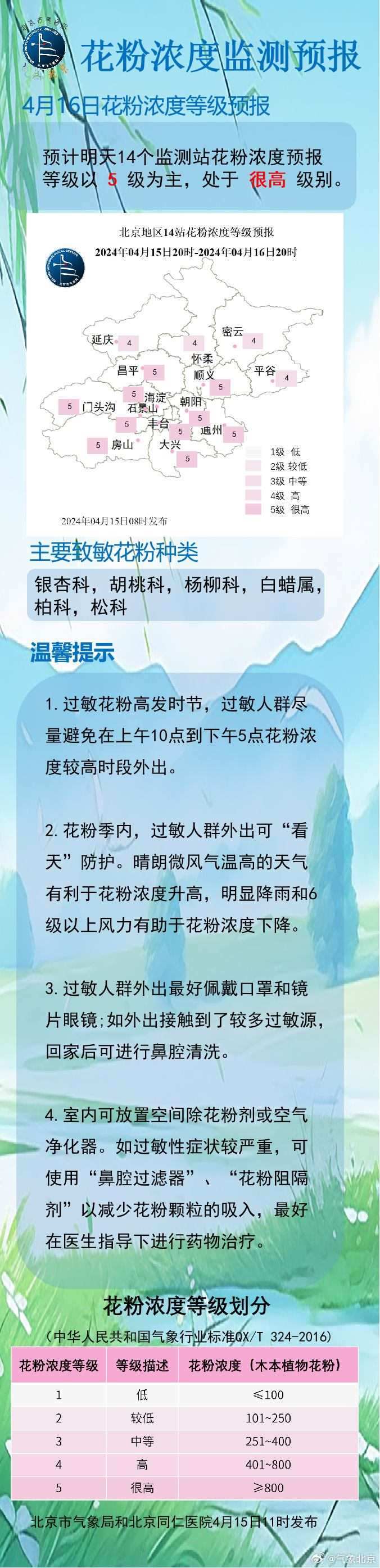 央視網(wǎng)消息:@?氣象北京 發(fā)布花粉實(shí)況及花粉濃度預(yù)報(bào),昨日(4月14日)北京6站大部花粉濃度等級(jí)為4級(jí)。目前本市主要致敏花粉種類為銀杏科、胡桃科、楊柳科,白蠟屬,柏科,松科等。預(yù)計(jì)4月15日14站花粉濃度以5級(jí)為主,為很高級(jí)別(>800)。今天有大風(fēng)沙塵天氣,大部分地區(qū)花粉濃度為很高級(jí)別,敏感人群外出需注意做好健康防護(hù)。