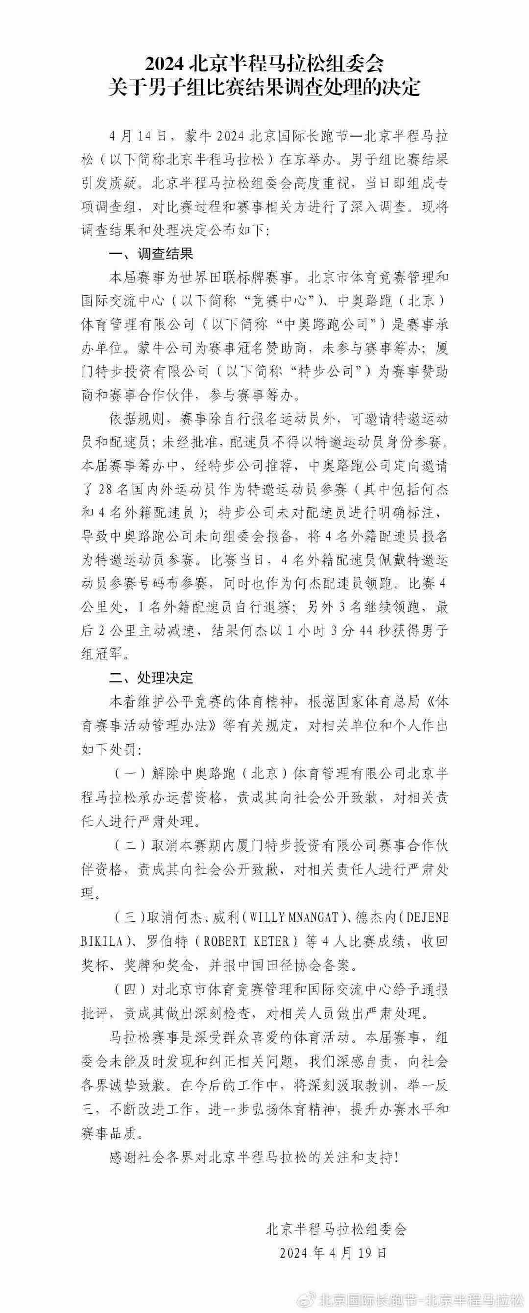 央視網(wǎng)消息:據(jù)@北京國(guó)際長(zhǎng)跑節(jié)-北京半程馬拉松 微博消息,2024北京半程馬拉松組委會(huì)發(fā)布關(guān)于男子組比賽結(jié)果調(diào)查處理的決定。詳情如下: