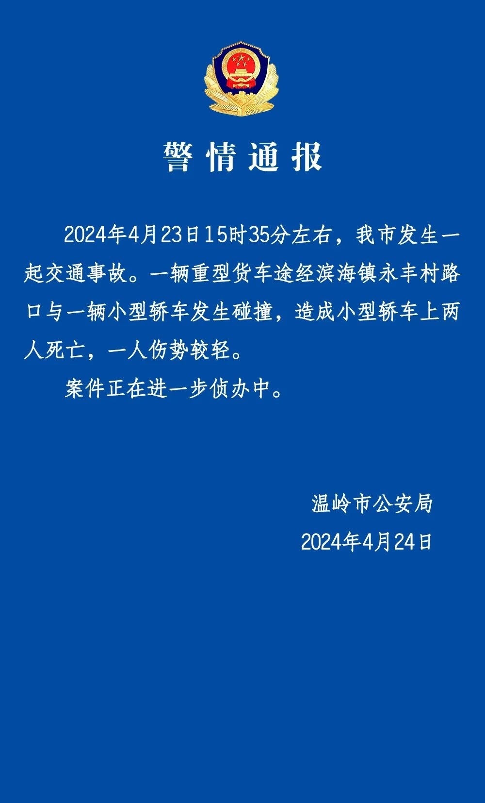 央視網(wǎng)消息:溫嶺市公安局4月24日發(fā)布警情通報:2024年4月23日15時35分左右,我市發(fā)生一起交通事故。一輛重型貨車途經(jīng)濱海鎮(zhèn)永豐村路口與一輛小型轎車發(fā)生碰撞,造成小型轎車上兩人死亡,一人傷勢較輕。