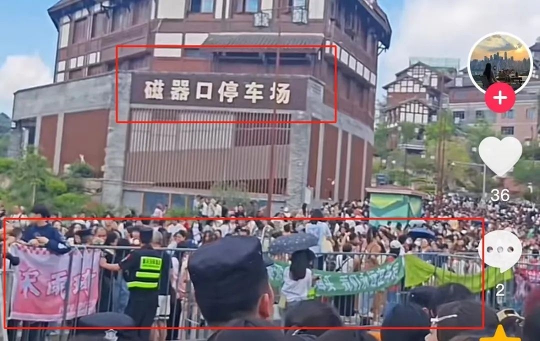 根據(jù)視頻顯示的“磁器口停車場(chǎng)”檢索視頻平臺(tái)相關(guān)內(nèi)容,有不少網(wǎng)友在4月19日發(fā)布了綜藝節(jié)目《奔跑吧》在當(dāng)?shù)劁浿茣r(shí)的畫面,通過比對(duì)可以發(fā)現(xiàn),網(wǎng)傳視頻中出現(xiàn)的圍欄、安保分布情況、以及圍欄上懸掛的不同顏色應(yīng)援橫幅等元素都與路人拍攝的清晰版視頻一致。
