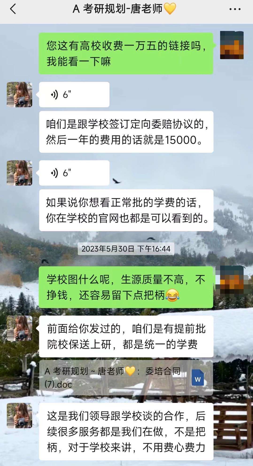 來自北京的陳鑫(化名)說,他被上述話術(shù)吸引,去年5月報(bào)了廣州研才教育機(jī)構(gòu)的“院校推免保送研究生課程”。咨詢時(shí),招生老師向他承諾“渠道直錄,考研保過”,并稱還能通過“院校委培”的方式,幫他把20萬元左右的MBA學(xué)費(fèi)降為1.5萬元。