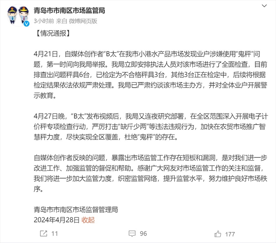 青島市市南區(qū)市場(chǎng)監(jiān)督管理局安排執(zhí)法人員對(duì)該市場(chǎng)進(jìn)行了全面檢查,目前排查出問題秤具6臺(tái),已檢定為不合格秤具3臺(tái),其他3臺(tái)正在檢定中,后續(xù)將根據(jù)檢定結(jié)果依法依規(guī)嚴(yán)肅處理。