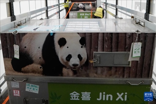 4月29日,在西班牙馬德里,工作人員轉(zhuǎn)運(yùn)大熊貓“金喜”和“茱萸”。新華社發(fā)(西班牙馬德里動(dòng)物園供圖)