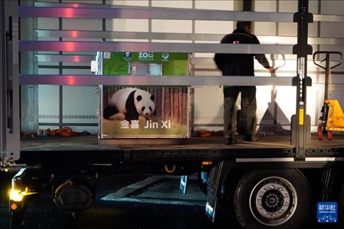 4月29日,在西班牙馬德里,工作人員轉(zhuǎn)運(yùn)大熊貓“金喜”。新華社發(fā)(西班牙馬德里動(dòng)物園供圖)