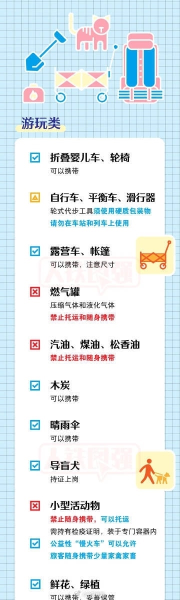 坐火車出游的小伙伴請注意!有些物品過不了安檢,出發(fā)前趕快篩查行李單,隨手轉(zhuǎn)發(fā)!①包裝密封完好、標志清晰且酒精體積百分含量大于或者等于24%、小于或者等于70%的酒類飲品累計不超過3000毫升。②充電寶標志清晰,單塊額定能量不超過100Wh。③自噴壓力容器,單體容器容積不超過150毫升,每種限帶1件,累計不超過600毫升。④含易燃成分的非自噴壓力容器日用品,單體容器容積不超過100毫升,每種限帶1件。