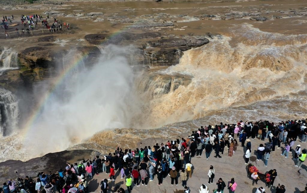 連日來,受黃河上中游降水影響,位于山西吉縣和陜西宜川縣交界的黃河壺口瀑布水流由清變黃,在陽光的照射下呈現(xiàn)出“濁浪滔天、金流飛瀑”的壯美景觀,吸引眾多游客觀看。