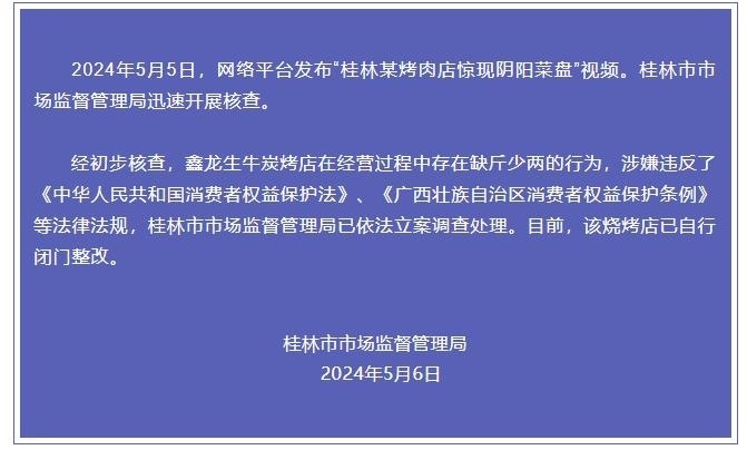 經(jīng)初步核查,鑫龍生牛炭烤店在經(jīng)營(yíng)過(guò)程中存在缺斤少兩的行為,涉嫌違反了《中華人民共和國(guó)消費(fèi)者權(quán)益保護(hù)法》、《廣西壯族自治區(qū)消費(fèi)者權(quán)益保護(hù)條例》等法律法規(guī),桂林市市場(chǎng)監(jiān)督管理局已依法立案調(diào)查處理。目前,該燒烤店已自行閉門(mén)整改。