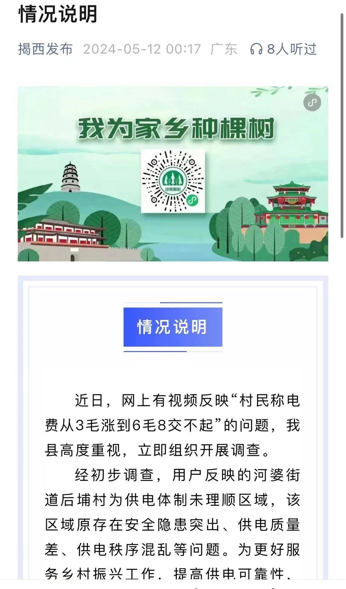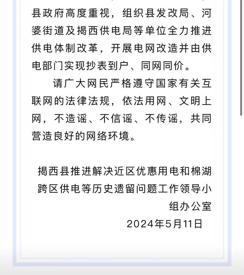 針對(duì)此事,“揭西發(fā)布”微信公眾號(hào)于5月12日發(fā)布了情況說明,表示對(duì)網(wǎng)上反映的“村民稱電費(fèi)從3毛漲到6毛8交不起”的問題高度重視,并已立即開展調(diào)查。