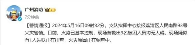 央視網(wǎng)消息:據(jù)廣州消防微博消息,2024年5月16日09時32分,廣州市消防支隊指揮中心接報荔灣區(qū)人民南路93號火災(zāi)警情。目前,火勢已基本控制,現(xiàn)場營救出9名被困人員均無大礙?,F(xiàn)場疑似有1人失聯(lián)正在排查,火災(zāi)原因正在調(diào)查中。