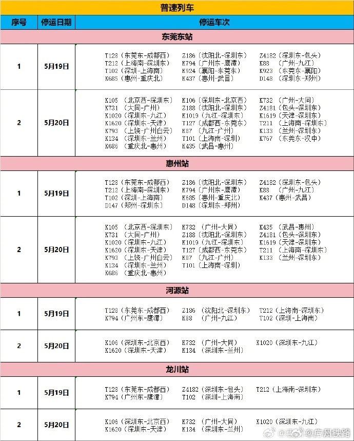 央視網(wǎng)消息:據(jù)@廣州鐵路 微博消息,根據(jù)中央氣象臺(tái)消息,近日湖南西南部、廣東大部有大到暴雨局地有特大暴雨。受此影響,為確保鐵路運(yùn)輸安全,鐵路部門將對途經(jīng)京廣、京九普速線等線路列車采取限速運(yùn)行和停運(yùn)措施,同時(shí)各車站列車將出現(xiàn)不同程度晚點(diǎn),由此給廣大旅客帶來的不便,敬請諒解。東莞東、惠州、河源、龍川站停運(yùn)車次具體如下。