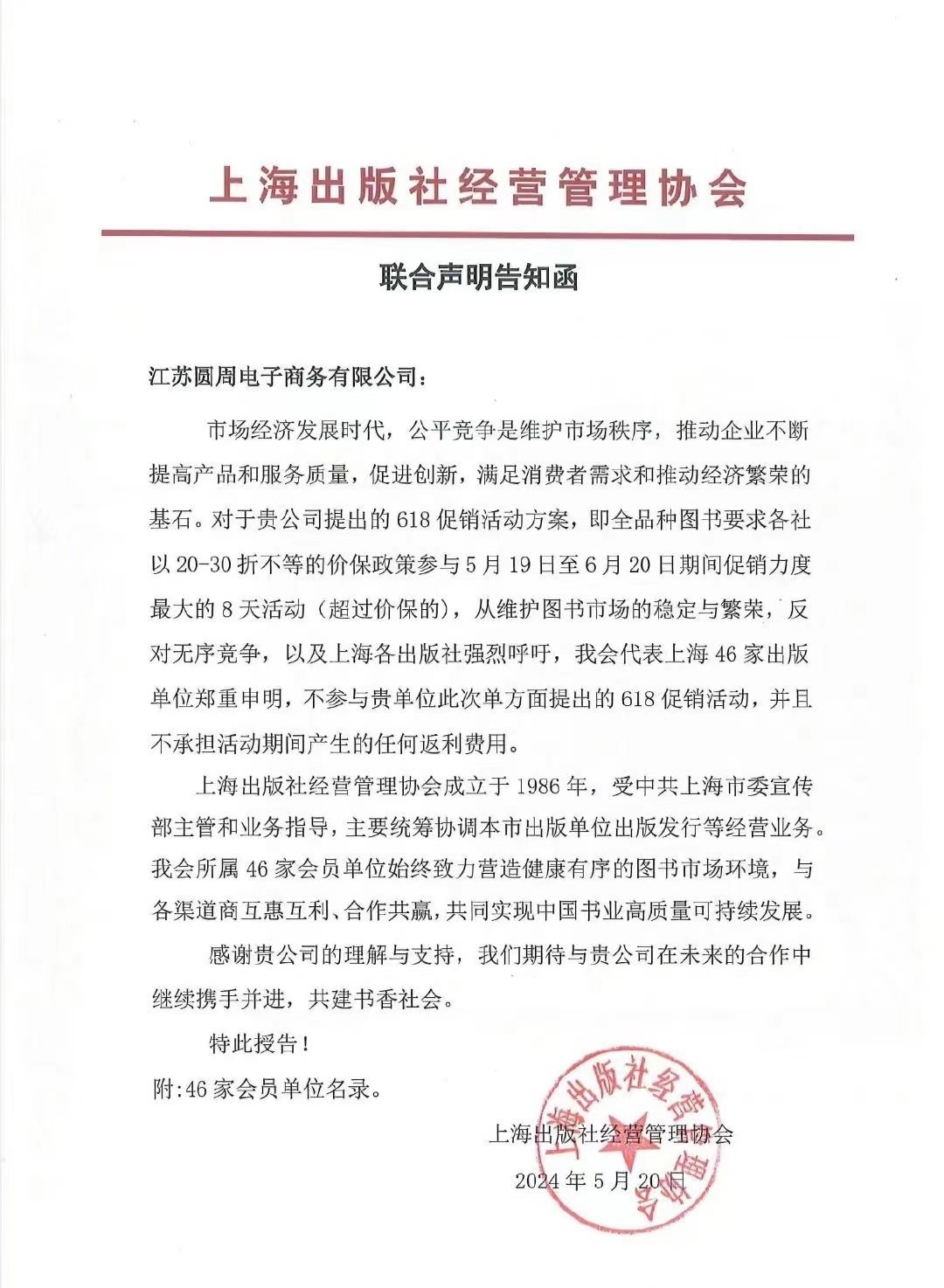 上海的46家出版社以上海出版社經營管理協會的名義聯合聲明退出京東618促銷