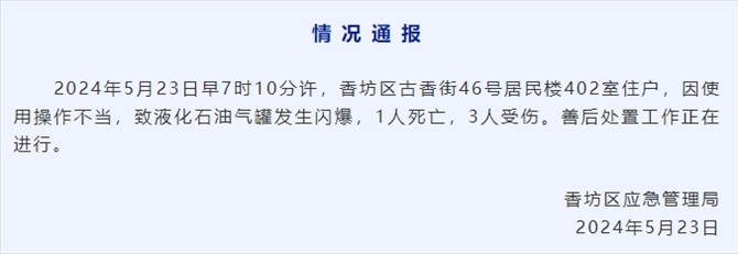 央視網(wǎng)消息:哈爾濱市香坊區(qū)應(yīng)急管理局發(fā)布情況通報,2024年5月23日早7時10分許,香坊區(qū)古香街46號居民樓402室住戶,因使用操作不當(dāng),致液化石油氣罐發(fā)生閃爆,1人死亡,3人受傷。善后處置工作正在進(jìn)行。