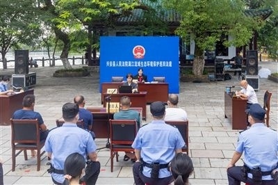 興安法院在靈渠景區(qū)內(nèi)巡回審理非法捕撈水產(chǎn)品案。資料圖片