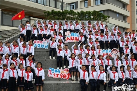 四川省內(nèi)江市東興區(qū)牛牦山小學,新入隊的少先隊員們一起分享獲得紅領巾的喜悅。