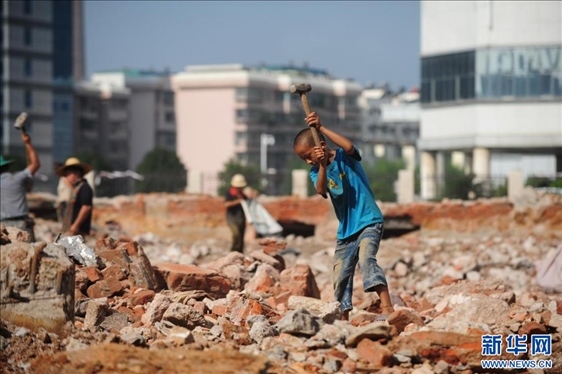 在柳州市北雀路一處工地,熊三耶和伙伴們?cè)诖蜩F(2013年8月29日攝)。新華社記者 黃孝邦 攝