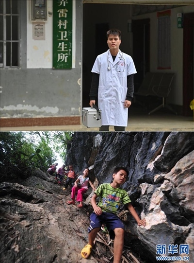 拼版照片:上圖為2023年5月24日,村醫(yī)蒙富松站在大化縣板升鄉(xiāng)弄雷村衛(wèi)生所前。新華社記者 胡星宇 攝。