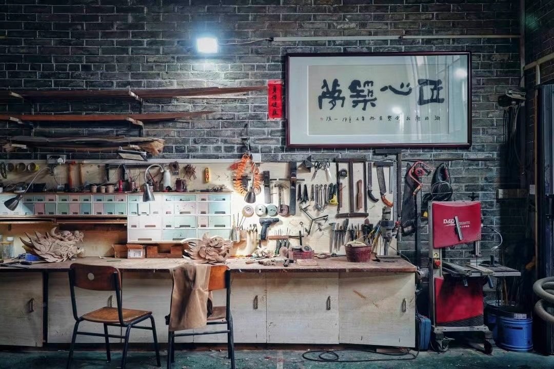 張偉潮身上的傷也沒斷過?!疤焯旄洞蚪坏?,有時(shí)候傷口剛縫了線,回到家一干活,刀口又開了”,手臂上、手背上遍布的傷疤,見證了每一個(gè)龍頭的誕生?!懊肯乱坏?,我都已經(jīng)想好了后面的第二步、第三步”,龍頭雕刻極為考究,從選料、切割,到粗雕、精雕,再到打磨、拋光、裱漆,十幾道繁瑣工序,全靠師傅的眼光和手藝。機(jī)械化、流水線,做不出龍頭嗎?在數(shù)不清的日夜里,光影斑駁間,張偉潮拿著父輩傳下的一刀一錘,一下一下,慢慢開鑿,給出自己的答案。