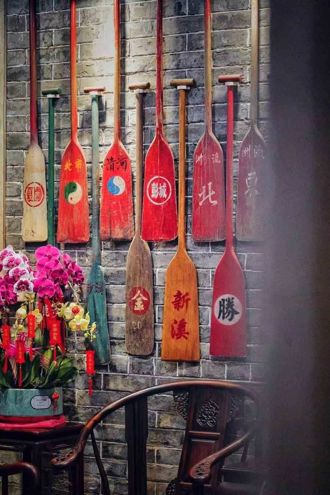 在張偉潮工作室的青磚墻上掛滿了劃龍舟所用的船槳?!皝砣↓堫^的人大多會送一面錦旗,我說不要錦旗,可以把你們不用的槳送給我。”這些年張偉潮陸續(xù)收到了300多支船槳,在他看來,每一把槳都蘊(yùn)含著自己隊(duì)伍、村落的故事,每一把都是獨(dú)一無二的,他要把船槳當(dāng)作錦旗一樣高高地掛在墻上。