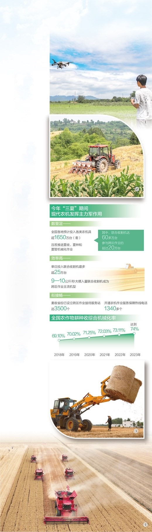 圖①:湖南省藍山縣塔峰鎮(zhèn)荷葉塘村,農技人員操作植保無人機在田間進行施肥作業(yè)。彭 華攝(人民視覺) 圖②:四川省蓬溪縣群利鎮(zhèn)五龍村,農機手駕駛播種機開展大豆玉米復合播種。吳奉家攝(人民視覺) 圖③:山東省棗莊市嶧城區(qū)古邵鎮(zhèn)新村,農機手實施小麥秸稈裝車運輸作業(yè)。孫 慧攝(人民視覺) 圖④:河南省舞陽縣田間,聯(lián)合收割機高效開展麥收作業(yè)。姚 彬攝(人民視覺) 數(shù)據(jù)來源:農業(yè)農村部