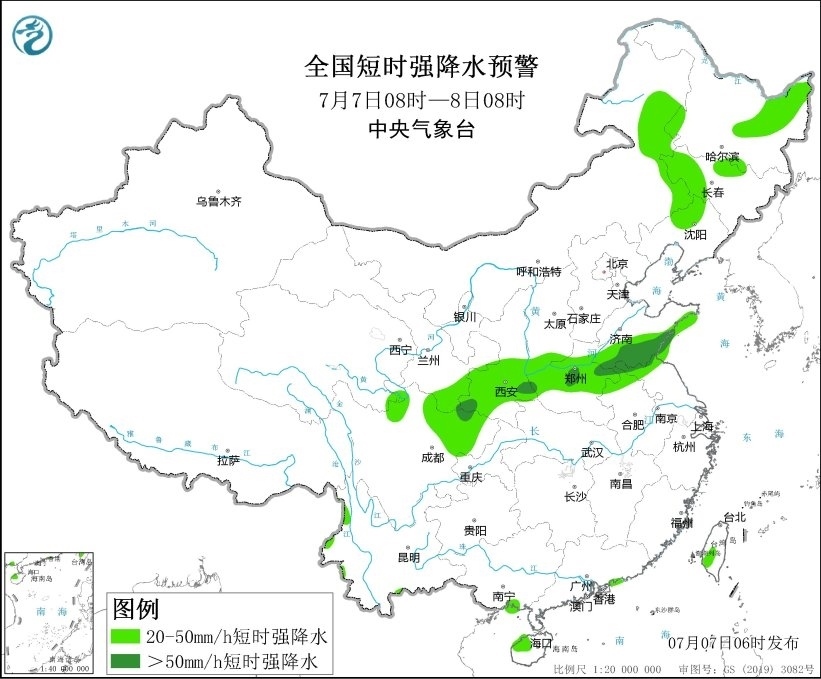 預(yù)計7月7日08時至8日08時,內(nèi)蒙古東北部、黑龍江東北部和西南部、吉林北部、青海東南部、甘肅東南部、陜西南部、山西西南部、山東南部、河南中部、安徽北部、江蘇北部、四川北部、重慶西部等地的部分地區(qū)將有8級以上雷暴大風(fēng)或冰雹天氣,其中,山東南部、河南東部、安徽北部、江蘇北部等地的部分地區(qū)將有10級以上雷暴大風(fēng),最大風(fēng)力可達(dá)11級以上;內(nèi)蒙古東部、黑龍江中東部、吉林中西部、遼寧北部、甘肅東南部、陜西中南部、山西南部、山東中南部、河南中北部、安徽北部、江蘇北部、四川北部、海南島西北部、臺灣島西南部等地的部分地區(qū)將有小時雨量大于20毫米的短時強降水天氣,其中,陜西東南部、山東南部、河南中部、江蘇北部、四川盆地西北部等地的部分地區(qū)將有小時雨量大于50毫米,最大可達(dá)70毫米以上。