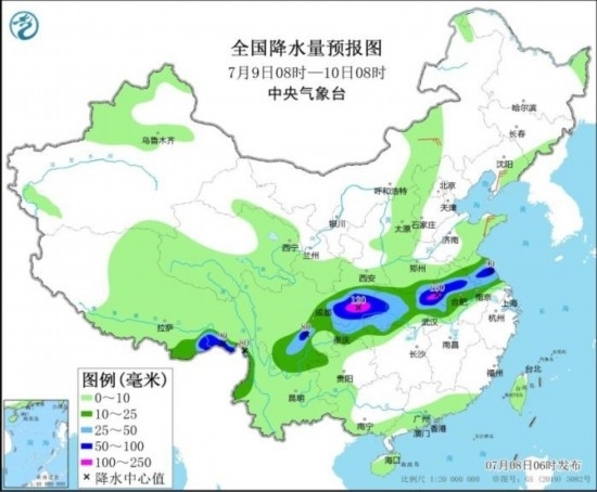 7月9日08時至10日08時,西北地區(qū)東南部、黃淮西南部、江淮、江漢大部、四川盆地等地的部分地區(qū)有中到大雨,其中,西藏東南部、陜西南部、河南南部、蘇皖中部、湖北東北部和西部、四川盆地北部等地的部分地區(qū)有暴雨或大暴雨(100~150毫米)。內蒙古中部、遼東半島、山東半島等地的部分地區(qū)有4~5級風;黃海中部海域有6~8級、陣風9級的旋轉風,其中部分海域風力可達9級、陣風10~11級。