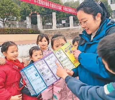 在湖南省江永縣實驗小學(xué),該縣農(nóng)商銀行工作人員為小學(xué)生宣講網(wǎng)絡(luò)金融知識。潘百旺攝(人民視覺)
