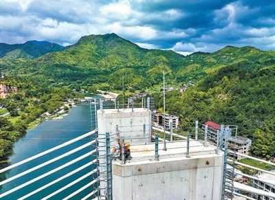 7月24日,中國鐵路上海局集團有限公司寧波工務(wù)段防洪檢查小組的鐵路工人對杭溫高鐵楠溪江大橋主塔進行巡檢。新華社記者 江 漢攝