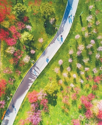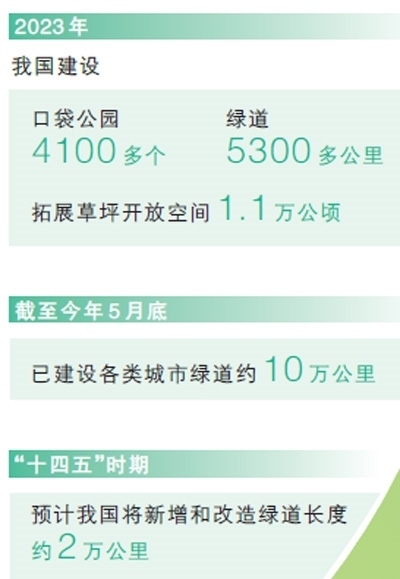 我國將綠色發(fā)展理念融入城鄉(xiāng)規(guī)劃建設(shè)管理中,穩(wěn)步推進建設(shè)連通區(qū)域、城市、社區(qū)的城鄉(xiāng)綠道體系。2023年,我國建設(shè)口袋公園4100多個、綠道5300多公里,拓展草坪開放空間1.1萬公頃,截至今年5月底,已建設(shè)各類城市綠道約10萬公里。