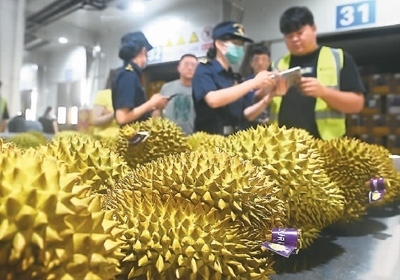 日前,在廣西憑祥市友誼關口岸海關查驗平臺,工作人員查驗一批進口榴蓮。新華社記者 陸波岸攝
