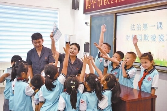 近日,吉林省四平市鐵西區(qū)人民法院依托法治副校長工作機制,攜手四平市陽光實驗小學舉辦了一場生動的“開學第一課”,通過與同學們互動問答、角色扮演等形式,為青少年健康成長營造良好法治環(huán)境,不斷提升青少年群體的法治素養(yǎng)。圖為法官與同學們在課堂上進行互動交流。(記者 孫兵 通訊員 任青陽)
