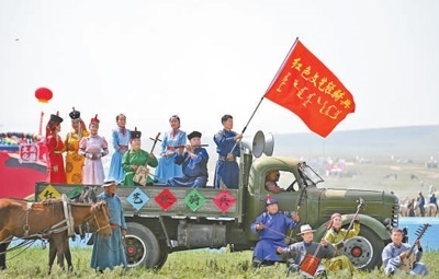 滋潤人心“紅色文藝輕騎兵”烏蘭牧騎隊(duì)員在內(nèi)蒙古草原那達(dá)慕開幕式上表演。新華社記者 貝 赫攝