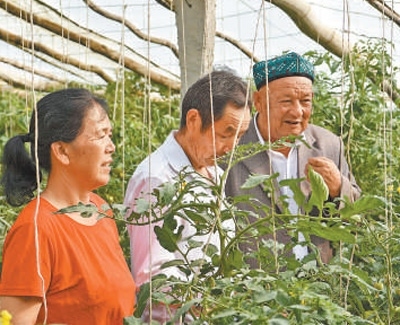 沙吾爾·芒力克(右一)和村民交流蔬菜種植經(jīng)驗。