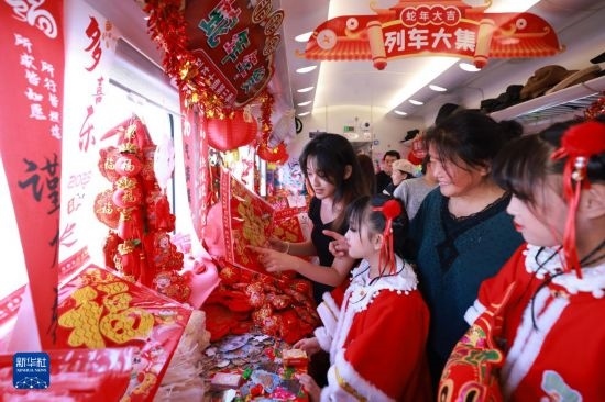 1月17日,在4187次列車的“列車大集”上,旅客在挑選春聯(lián)和“福”字。