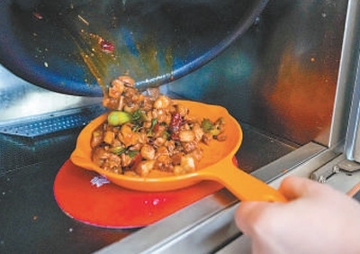 劉楊現(xiàn)場下單了一份干燒雙菇,炒好后,打開柜門的那一刻,香氣撲面而來?!翱隙ū任易约鹤龅暮贸?,比一些餐廳的味道也好?!眲钫f:“如果家中來客,炒3個(gè)菜帶回家,總共也就幾十元,比下館子劃算得多。”